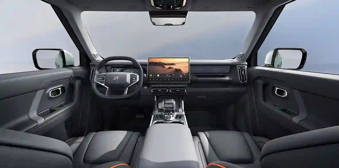 Интерьер JETOUR T1 продуман с точки зрения эргономики и качества материалов. Перфорированные текстурированные сиденья Shuyun («комфорт, как на облаке») выполнены из гипоаллергенных приятных на ощупь материалов. Спортивный руль, рычаг переключения передач в авиационном стиле, цифровая приборная панель 10,25 дюймов, 12,8- или 15,6-дюймовый центральный экран управления обеспечивают максимальное удобство эксплуатации. На передней панели со стороны пассажира органично интегрировано изображение карты мира. Водитель и пассажиры могут рассчитывать на высокий уровень комфорта благодаря увеличенному пространству в салоне, а панорамная крыша визуально делает его еще просторнее и светлее. В салоне предусмотрено 45 отсеков для хранения, а объём багажного отделения достигает 1 455 литров при сложенных сиденьях второго ряда.