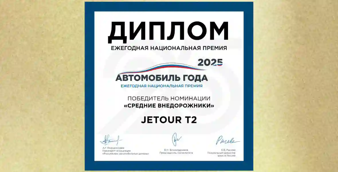 Ежегодная национальная премия «Автомобиль года в России» была впервые вручена в 2000 году и за минувшие четверть века превратилась в один из наиболее значимых медийных проектов российского автомобильного рынка. Определение лауреатов проводится интернет-голосованием, в котором может принять участие любой желающий россиянин старше 18 лет. Конкуренция в номинации «Средние внедорожники» оказалась очень высокой – на это звание претендовали сразу 74 автомобиля с традиционными ДВС, представляющие весь диапазон ценовых категорий, от массового сегмента до сегмента «люкс». Но пользующийся у российских автомобилистов неизменным успехом с момента выхода на рынок JETOUR T2 стал лучшим в номинации.